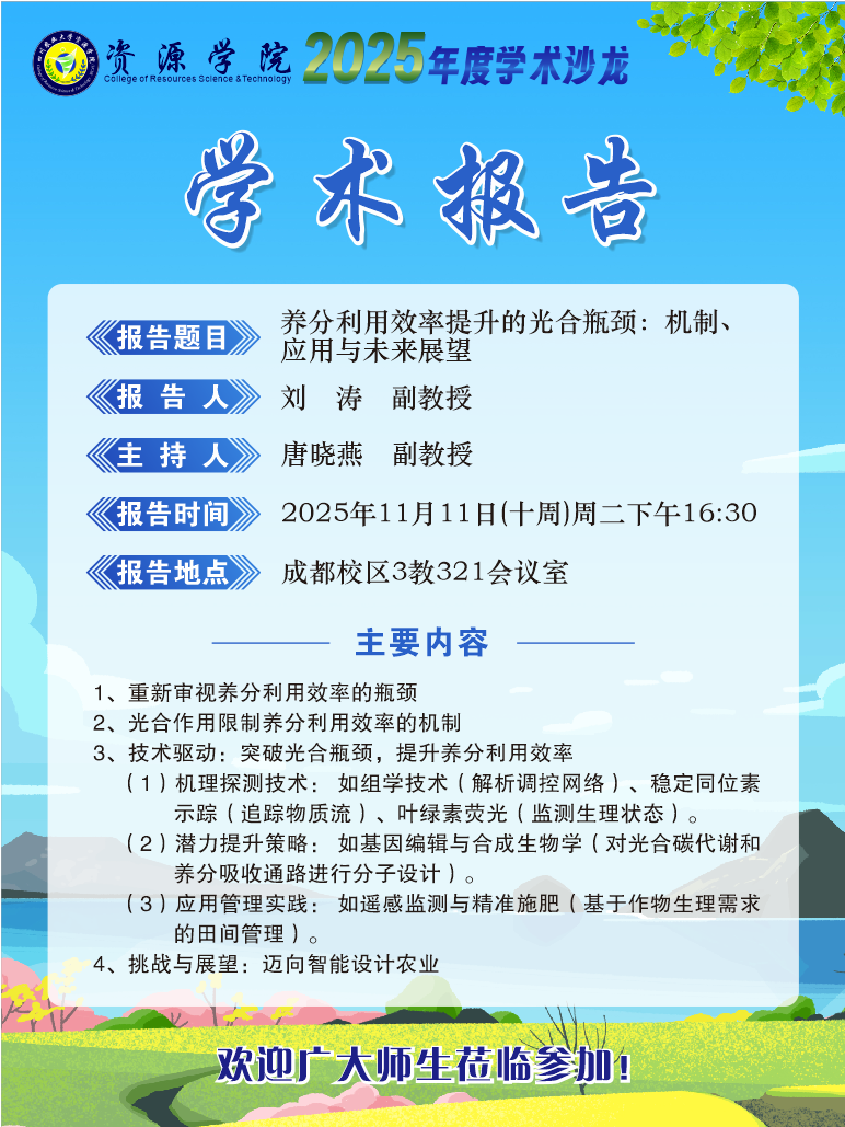 导航痕迹 英国365(集团)公司官方网站 英国365(集团)公司官方网站 学院首页 科研动态 正文 学院新闻 通知公告 科研动态 就业服务 学生工作 聚焦资源 师生风采 【学术信息】养分利用效率提升的光合瓶颈:机制,应用与未来展望 2025年11月06日 上一条:【学术动态】学术沙龙系列活动之“养分利用效率提升的光合瓶颈:机制,应用与未来展望”顺利举办 下一条:【学术信息】Developing climate smart and biochar-based platform technologies for high value crops furtures 【关闭】